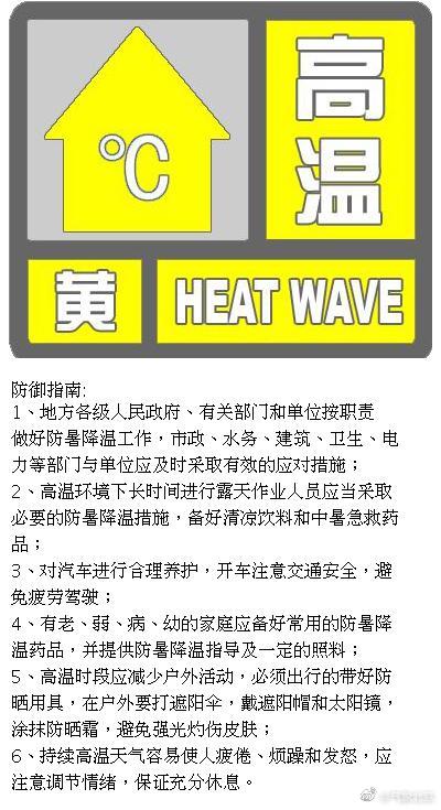 據(jù)北京市氣象局官方微博消息,北京市氣象臺2020年6月14日6時(shí)50分發(fā)布高溫黃色預(yù)警信號:預(yù)計(jì)6月14日至16日,本市大部分地區(qū)日最高氣溫將達(dá)35℃以上,請注意防范。未來三天天氣以晴為主,紫外線很強(qiáng),體感炎熱,外出需注意防暑防曬,心腦血管疾病和高血壓患者應(yīng)減少高溫時(shí)段戶外活動(dòng)時(shí)間。 ????