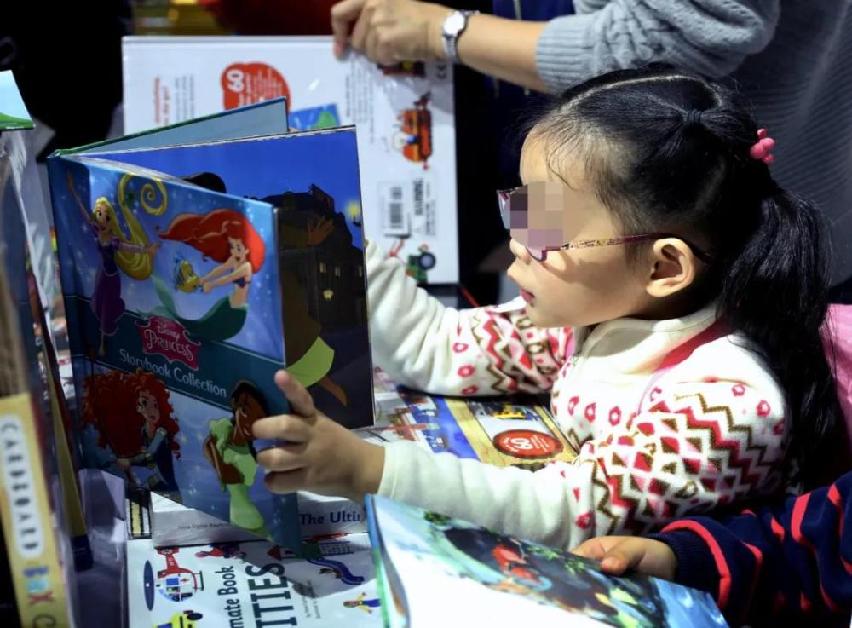 小讀者在童書展的公共閱讀區(qū)讀書