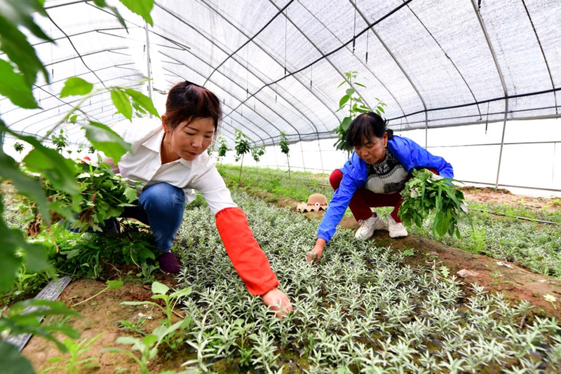 山西省呂梁市嵐縣王獅鄉(xiāng)蛤蟆神村的村民在造林合作社為沙棘苗除草(6月9日攝)。新華社記者 曹陽(yáng) 攝