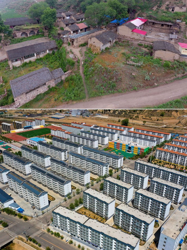 拼版照片:上圖為2017年6月22日拍攝的山西省忻州市岢嵐縣趙家洼村(無(wú)人機(jī)照片);下圖為5月20日拍攝的岢嵐縣廣惠園移民新區(qū),部分趙家洼村村民居住在這里(無(wú)人機(jī)照片)。新華社記者 曹陽(yáng) 攝