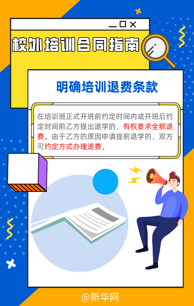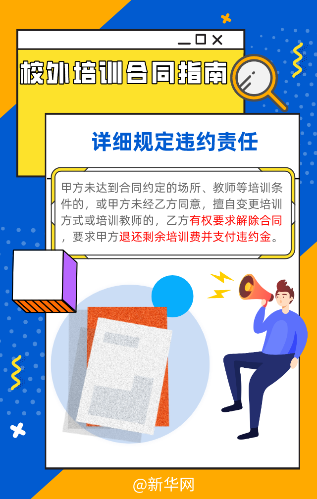 長(zhǎng)期以來(lái),校外培訓(xùn)機(jī)構(gòu)的資質(zhì)問(wèn)題,以及部分培訓(xùn)機(jī)構(gòu)存在違規(guī)收費(fèi)、退費(fèi)難、卷款“跑路”現(xiàn)象,這些令學(xué)生和家長(zhǎng)發(fā)愁。教育部、市場(chǎng)監(jiān)管總局近日發(fā)布《中小學(xué)生校外培訓(xùn)服務(wù)合同(示范文本)》,供培訓(xùn)者(學(xué)員)監(jiān)護(hù)人與開(kāi)展中小學(xué)生校外培訓(xùn)的培訓(xùn)機(jī)構(gòu)簽訂培訓(xùn)合同時(shí)參照使用,為規(guī)范校外培訓(xùn)做出新的探索。一起來(lái)看看,這份“國(guó)家版”標(biāo)準(zhǔn)合同有哪些亮點(diǎn)?