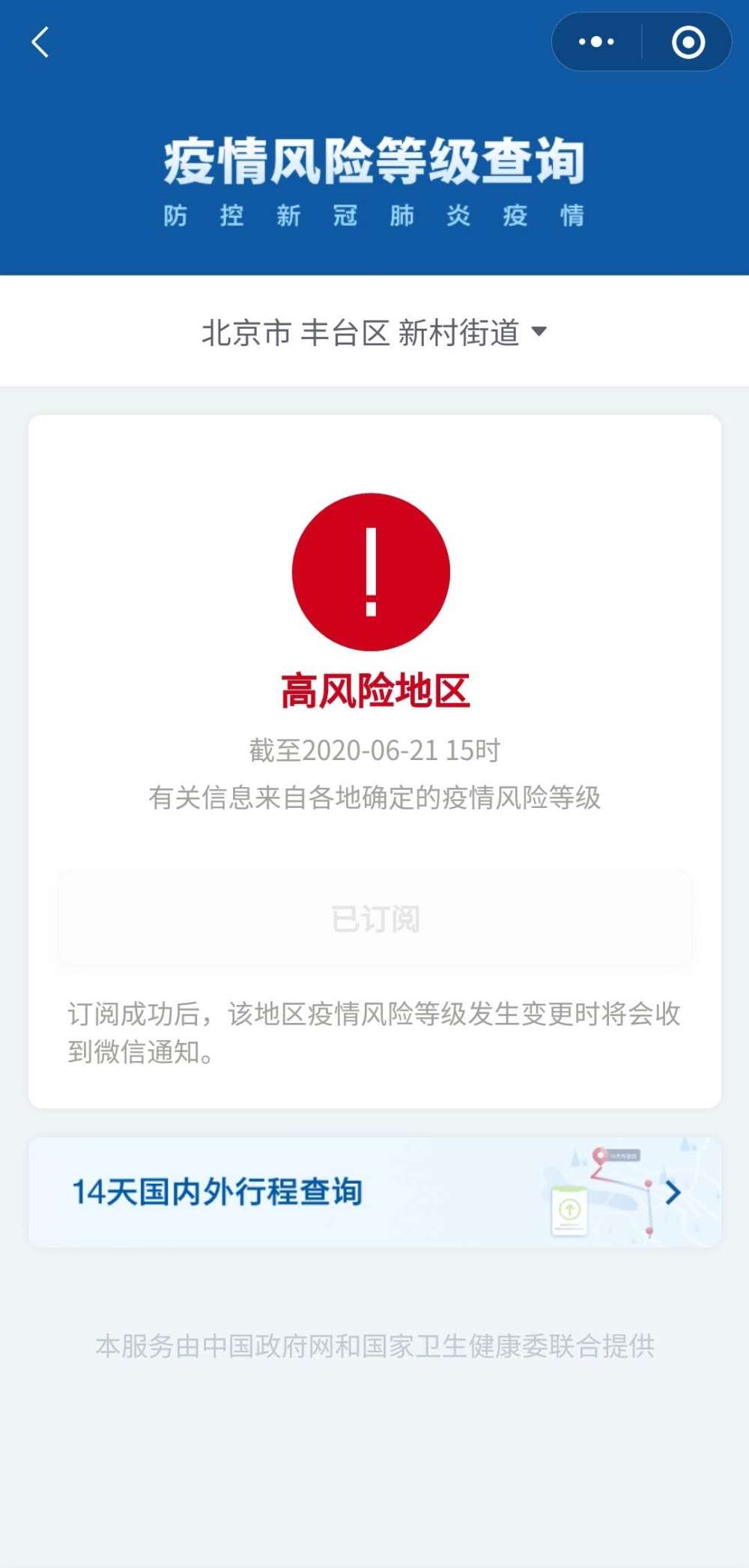 記者從國務院客戶端小程序“疫情風險等級查詢”上了解到,截至6月21日15時,北京市豐臺區(qū)新村街道、大興區(qū)黃村(地區(qū))鎮(zhèn)由中風險調(diào)整為高風險。北京市豐臺區(qū)長辛店街道、右安門街道,大興區(qū)安定鎮(zhèn),海淀區(qū)八里莊街道,通州區(qū)北苑街道由低風險調(diào)整為中風險。