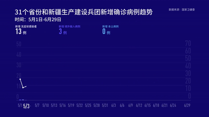 6月29日0—24時,31個?。ㄗ灾螀^(qū)、直轄市)和新疆生產(chǎn)建設(shè)兵團(tuán)報(bào)告新增確診病例19例,其中境外輸入病例11例(廣東4例,上海3例,四川3例,甘肅1例),本土病例8例(北京7例,上海1例);無新增死亡病例;新增疑似病例1例,為境外輸入病例(在上海)。