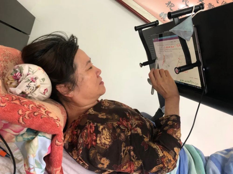 學(xué)校安排其他老師給李靖敏代課。半個月之后,6月中旬,北京再次出現(xiàn)新增病例,高三年級又重新回到線上教學(xué)。李靖敏提出,自己可以上網(wǎng)課。她把一個平板電腦靠著支架固定在身體上方,然后用手寫筆在觸摸屏上書寫、標(biāo)記,這樣在家的學(xué)生就能同步看到。