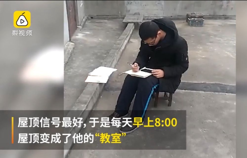 特殊時期,學(xué)校選擇了網(wǎng)上開課。小通因家中沒有WiFi,又舍不得用流量,就向鄰居求助,蹭隔壁家的WIFI。屋頂信號最好,于是才有了“學(xué)霸上屋頂”的勵志一幕。