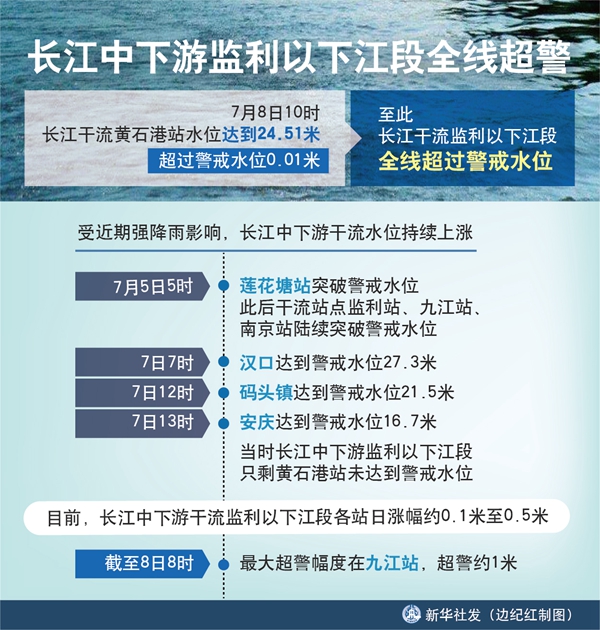 新華社武漢7月8日電(記者李思遠(yuǎn)、樂文婉)8日10時(shí),長江干流黃石港站水位達(dá)到24.51米,超過警戒水位0.01米。至此,長江干流監(jiān)利以下江段全線超過警戒水位。