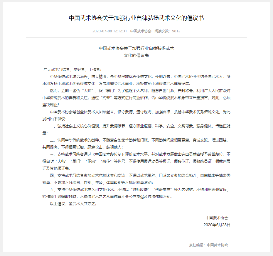 中國武術(shù)協(xié)會(huì)在其網(wǎng)站發(fā)布《關(guān)于加強(qiáng)行業(yè)自律弘揚(yáng)武術(shù)文化的倡議書》,號(hào)召全體武術(shù)人團(tuán)結(jié)起來,恪守武德、遵守規(guī)則、加強(qiáng)自律,弘揚(yáng)中華武術(shù)優(yōu)秀傳統(tǒng)文化,并倡議武術(shù)習(xí)練者不得自封“大師”“掌門”“正宗”“嫡傳”等稱號(hào),不得以武術(shù)拳種、門派名義參加綜合格斗、自由搏擊等搏擊類賽事,不參加不分項(xiàng)目、性別、年齡、體重級(jí)別等不規(guī)范賽事活動(dòng)。