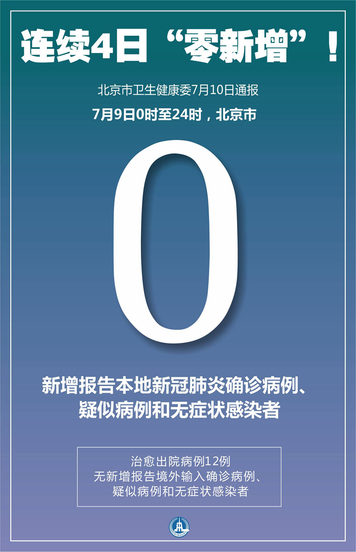 新華社北京7月10日電(記者俠克)北京市衛(wèi)生健康委10日通報,7月9日0時至24時,北京市無新增報告本地新冠肺炎確診病例、疑似病例和無癥狀感染者,治愈出院病例12例;無新增報告境外輸入確診病例、疑似病例和無癥狀感染者。