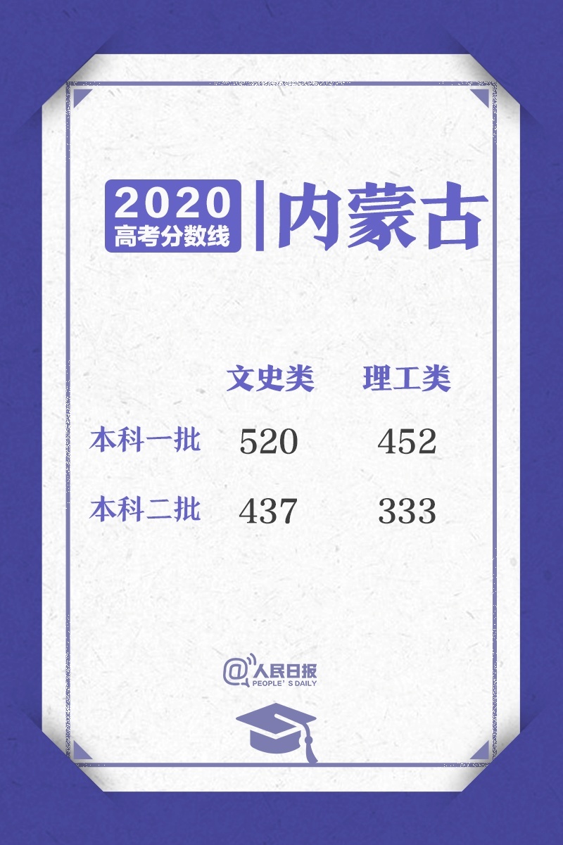 本科一批:理工類為452分,文史類為520分;本科二批:理工類為333分,文史類為437分。
