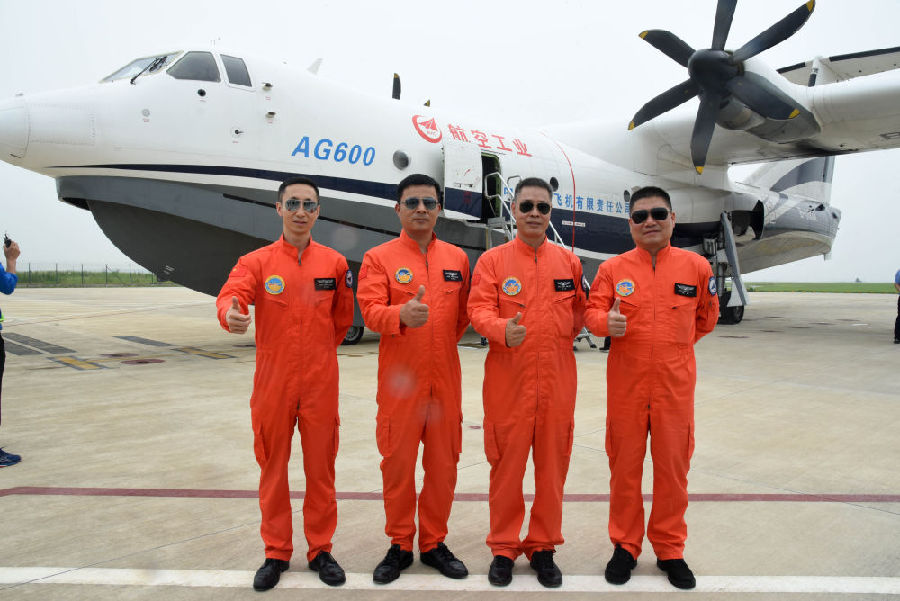 7月26日,機組人員在水陸兩棲飛機AG600成功進(jìn)行海上首飛返回日照山字河機場后合影。新華社記者 王凱 攝
