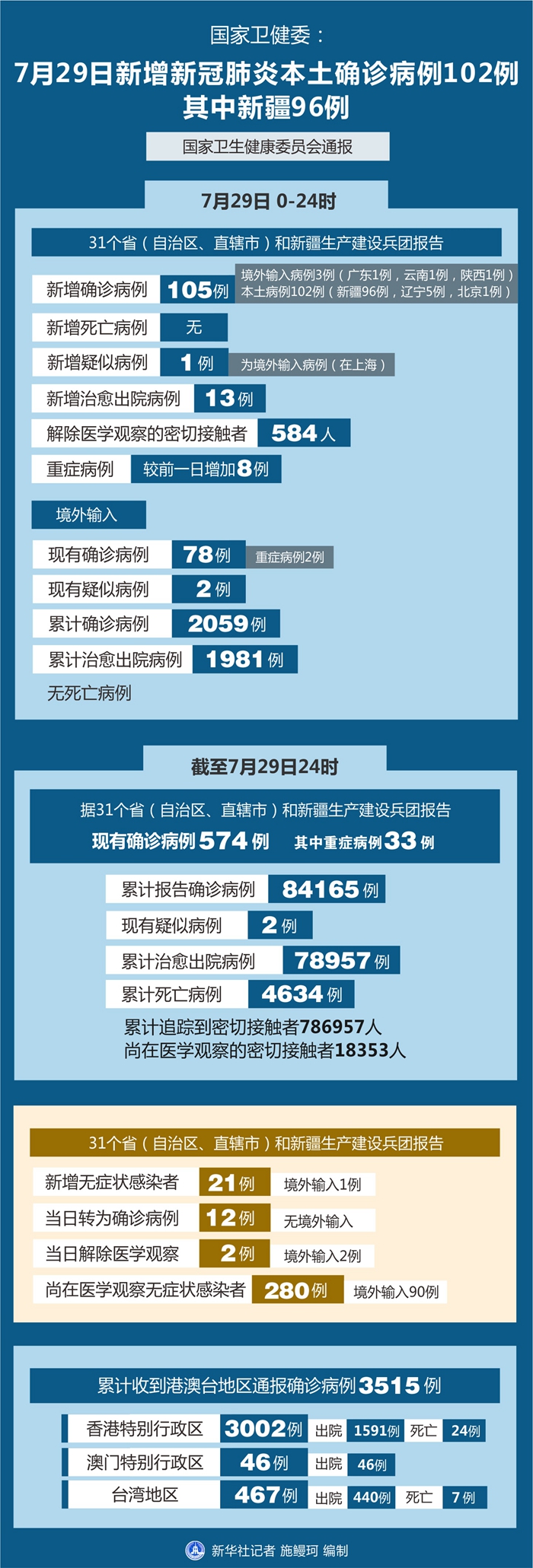 截至7月29日24時(shí),據(jù)31個(gè)?。ㄗ灾螀^(qū)、直轄市)和新疆生產(chǎn)建設(shè)兵團(tuán)報(bào)告,現(xiàn)有確診病例574例(其中重癥病例33例),累計(jì)治愈出院病例78957例,累計(jì)死亡病例4634例,累計(jì)報(bào)告確診病例84165例,現(xiàn)有疑似病例2例。累計(jì)追蹤到密切接觸者786957人,尚在醫(yī)學(xué)觀察的密切接觸者18353人。