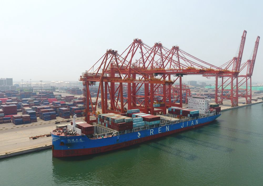7月16日,一艘輪船靠泊在唐山港京唐港區(qū)集裝箱碼頭裝貨。新華社記者 楊世堯 攝
