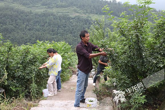 村民在劉瑞發(fā)(右一)的花椒地里采花椒。馬媛攝 華龍網(wǎng)發(fā)