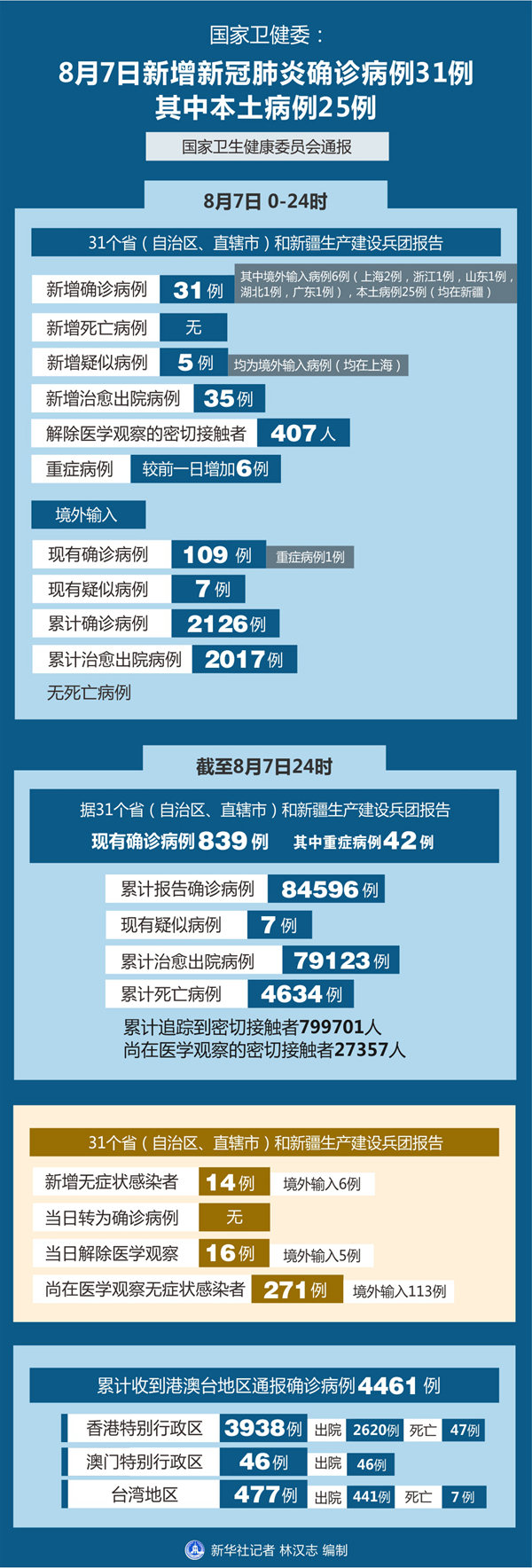 新華社北京8月8日電 國(guó)家衛(wèi)生健康委員會(huì)8日通報(bào),8月7日0—24時(shí),31個(gè)?。ㄗ灾螀^(qū)、直轄市)和新疆生產(chǎn)建設(shè)兵團(tuán)報(bào)告新增新冠肺炎確診病例31例,其中境外輸入病例6例(上海2例,浙江1例,山東1例,湖北1例,廣東1例),本土病例25例(均在新疆);無(wú)新增死亡病例;新增疑似病例5例,均為境外輸入病例(均在上海)。