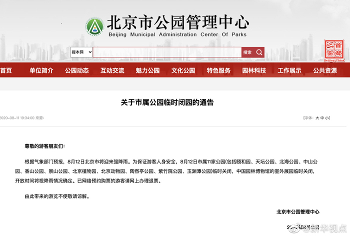 北京市公園管理中心11日晚發(fā)布關(guān)于市屬公園臨時(shí)閉園的通告。通告稱,根據(jù)氣象部門預(yù)報(bào),8月12日北京市將迎來強(qiáng)降雨。為保證游客人身安全,8月12日市屬11家公園(包括頤和園、天壇公園、北海公園、中山公園、香山公園、景山公園、北京植物園、北京動(dòng)物園、陶然亭公園、紫竹院公園、玉淵潭公園)臨時(shí)關(guān)閉,中國(guó)園林博物館的室外展園臨時(shí)關(guān)閉,開放時(shí)間將視降雨情況確定。已網(wǎng)絡(luò)預(yù)約購(gòu)票的游客請(qǐng)網(wǎng)上辦理退票。(記者魏夢(mèng)佳)?