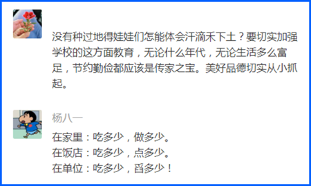 消費(fèi)不等于浪費(fèi)。有網(wǎng)友跟帖說(shuō),未富先奢,就是忘本。在吃飯問(wèn)題上,勤儉節(jié)約的優(yōu)秀傳統(tǒng)不能忘!糧食安全,要在生產(chǎn)端“開(kāi)源”,也要在消費(fèi)端“節(jié)流”。