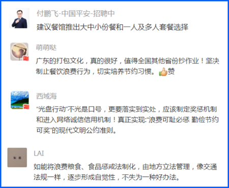 總書(shū)記強(qiáng)調(diào),要加強(qiáng)立法,強(qiáng)化監(jiān)管,采取有效措施,建立長(zhǎng)效機(jī)制,堅(jiān)決制止餐飲浪費(fèi)行為。網(wǎng)友們就此積極獻(xiàn)計(jì)獻(xiàn)策。