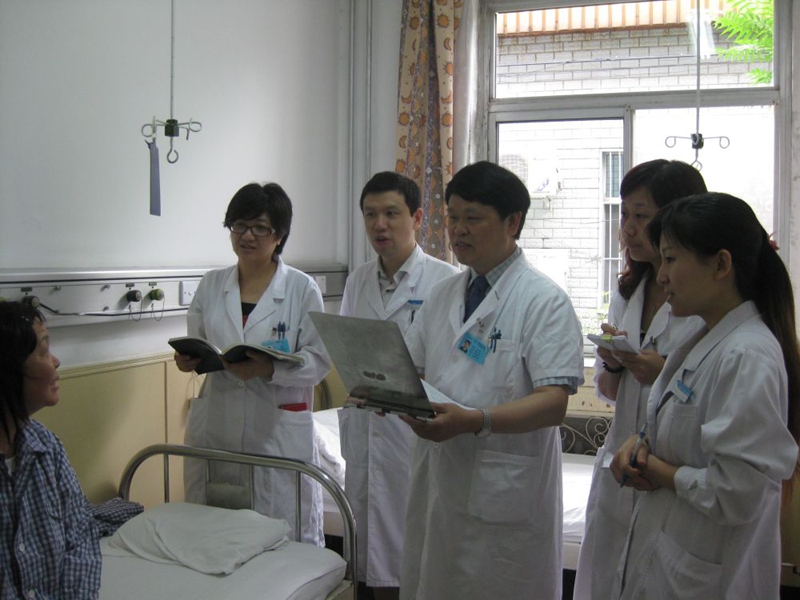 中國(guó)醫(yī)學(xué)科學(xué)院腫瘤醫(yī)院徐兵河教授(右三)、馬飛教授(右四)攜治療團(tuán)隊(duì)在病房查問(wèn)乳腺癌患者康復(fù)情況。圖片由受訪者提供