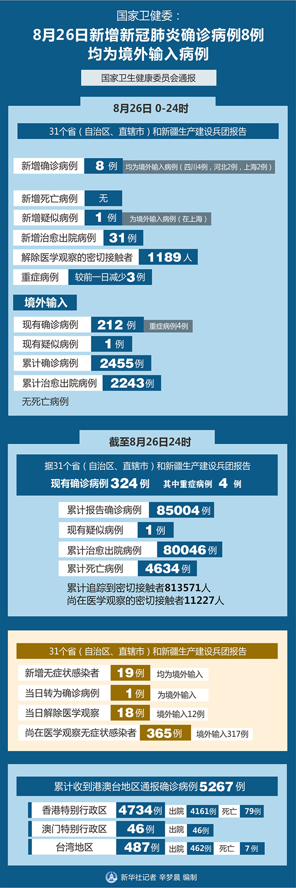 新華社北京8月27日電? 國家衛(wèi)健委27日通報,8月26日0—24時,31個?。ㄗ灾螀^(qū)、直轄市)和新疆生產(chǎn)建設(shè)兵團報告新增確診病例8例,均為境外輸入病例(四川4例,河北2例,上海2例);無新增死亡病例;新增疑似病例1例,為境外輸入病例(在上海)。