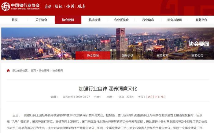 8月24日,廈門國際銀行北京分行發(fā)文證實(shí)此事并致歉。該行表示,員工楊某反映的中關(guān)村支行營業(yè)部某領(lǐng)導(dǎo)及該支行個別員工在私下非公款聚餐中,確系存在因酒后失態(tài)而對楊某做出言語及行為失當(dāng)?shù)扰e動,上述行為確實(shí)對其本人造成了影響和傷害,對此深表歉意。