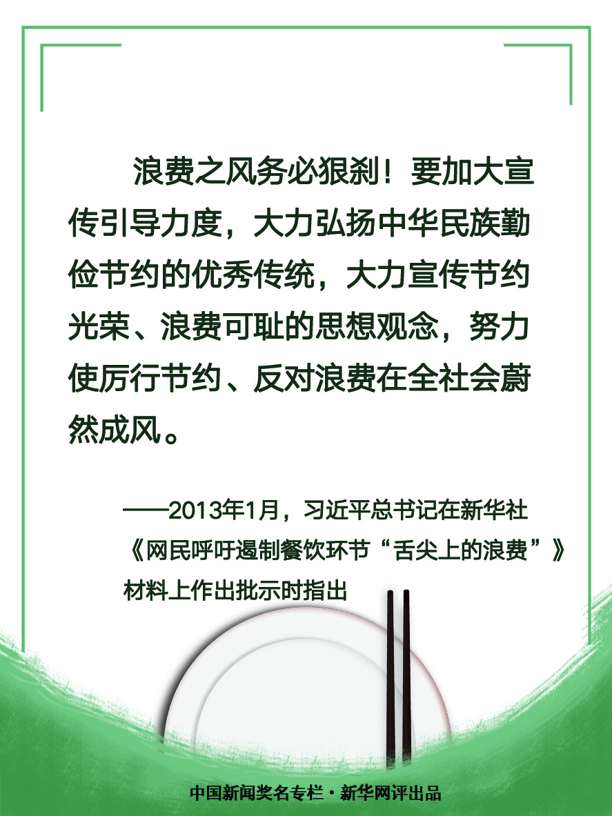 民以食為天,食以儉養(yǎng)德。餐飲浪費現(xiàn)象存在著巨大危害,全社會必須深刻認識勤儉節(jié)約的重要性。當務(wù)之急,各地各部門、各餐飲機構(gòu)、每個人都要行動起來,采取加強立法、強化監(jiān)管、加強宣傳教育等舉措,從我做起,從小事做起,進一步營造勤儉節(jié)約之風。(文字:馬若虎 海報:張倩)