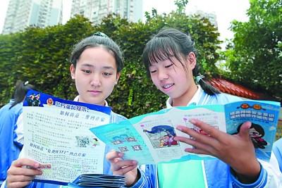 9月15日,四川省內(nèi)江市東興初級中學學生正在閱讀網(wǎng)絡安全宣傳資料。蘭自濤攝/光明圖片