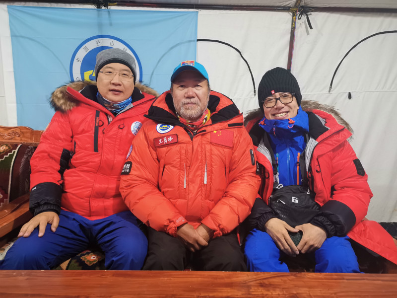 谷業(yè)凱(右)與中國登山隊(duì)隊(duì)長王勇峰(中)、人民日報記者袁泉(左)登頂前夜在珠峰大本營。