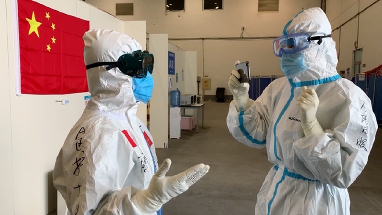3月7日,武漢首批最大規(guī)模方艙醫(yī)院東西湖方艙醫(yī)院休艙現(xiàn)場(chǎng),人民日?qǐng)?bào)記者吳姍(右)見證最后一批轉(zhuǎn)院患者出艙。
