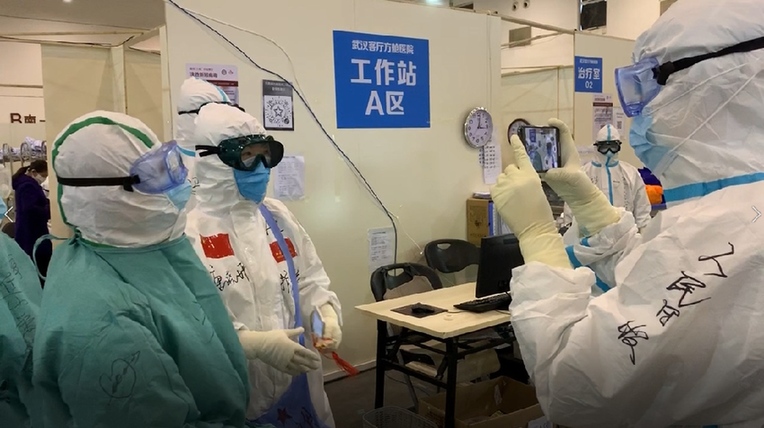 2月26日凌晨,人民日?qǐng)?bào)記者吳姍在武漢市金銀潭醫(yī)院ICU重癥病區(qū)采訪。
