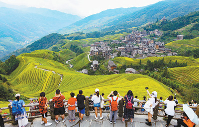 觀賞梯田秋色,體驗民俗風(fēng)情,廣西桂林市龍勝各族自治縣龍脊梯田景區(qū)旅游持續(xù)火爆。圖為10月3日,游客在景區(qū)觀光游覽。吳生斌攝(影像中國)