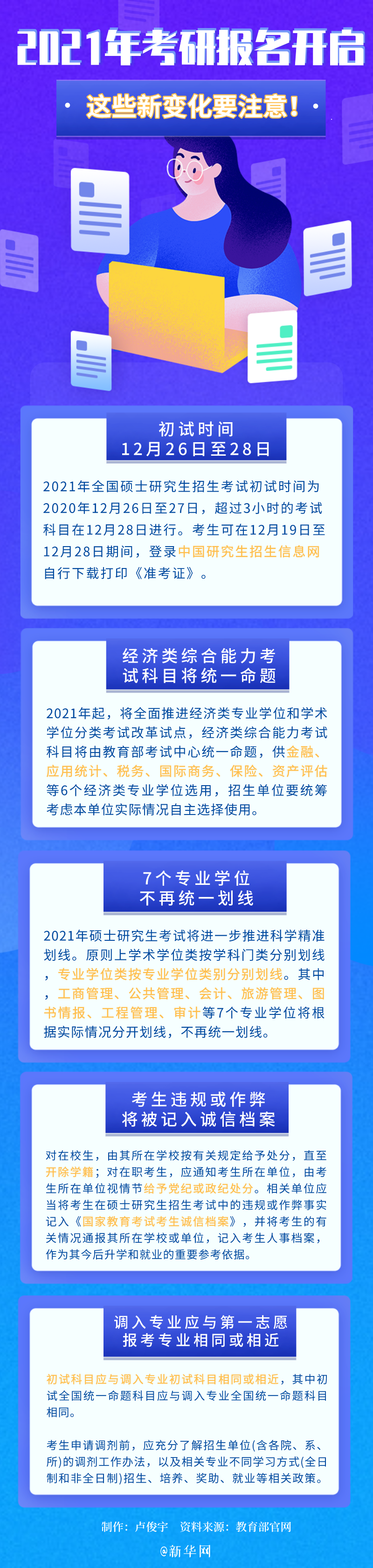 編輯: 盧俊宇 設(shè)計: 2020年10月13日 09:43:50 來源: 新華網(wǎng)??? 10月10日起至10月31日,全國碩士研究生招生考試開始正式報名,每天9:00-22:00,考生可登錄網(wǎng)上報名平臺填報報名信息。2021年研究生招生考試在考試命題、調(diào)劑、專業(yè)劃線等方面都有所調(diào)整,一圖帶你速覽這些方面的變化。