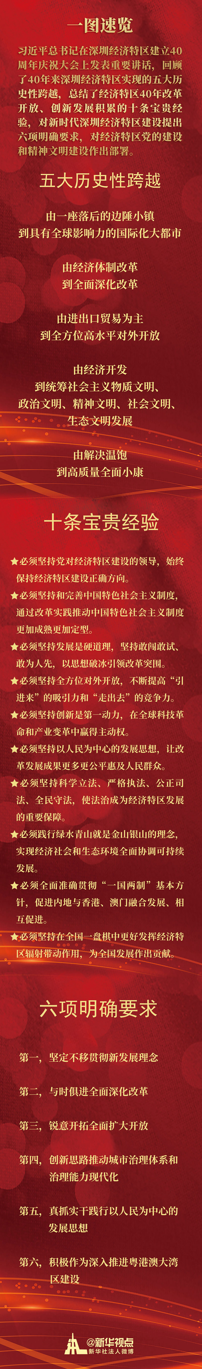 習(xí)近平總書記在深圳經(jīng)濟(jì)特區(qū)建立40周年慶祝大會上發(fā)表重要講話,回顧了40年來深圳經(jīng)濟(jì)特區(qū)實(shí)現(xiàn)的五大歷史性跨越,總結(jié)了經(jīng)濟(jì)特區(qū)40年改革開放、創(chuàng)新發(fā)展積累的十條寶貴經(jīng)驗(yàn),對新時(shí)代深圳經(jīng)濟(jì)特區(qū)建設(shè)提出六項(xiàng)明確要求,對經(jīng)濟(jì)特區(qū)黨的建設(shè)和精神文明建設(shè)作出部署。