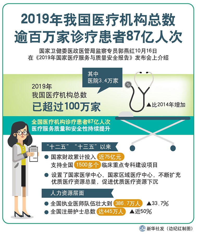 新華社北京10月16日電(記者呂諾、王琳琳)國(guó)家衛(wèi)健委醫(yī)政醫(yī)管局監(jiān)察專員郭燕紅16日在《2019年國(guó)家醫(yī)療服務(wù)與質(zhì)量安全報(bào)告》發(fā)布會(huì)上介紹,2019年,我國(guó)醫(yī)療機(jī)構(gòu)總數(shù)已超過(guò)100萬(wàn)家,其中醫(yī)院3.4萬(wàn)家。全國(guó)醫(yī)療機(jī)構(gòu)診療患者87億人次,醫(yī)療服務(wù)質(zhì)量和安全性持續(xù)提升。
