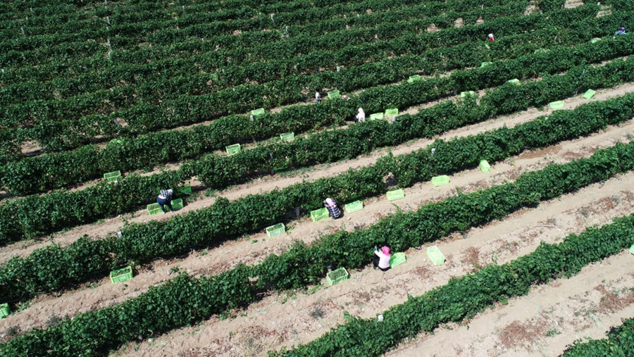 在寧夏銀川市永寧縣閩寧鎮(zhèn)的立蘭酒莊釀酒葡萄種植基地,農(nóng)戶在田間采摘葡萄(2019年9月3日攝,無人機照片)。新華社記者 王鵬 攝