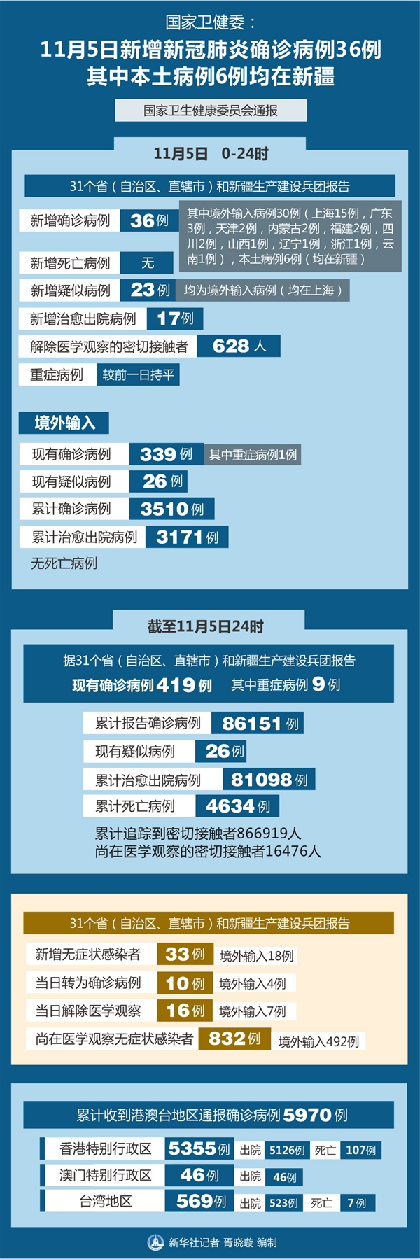 截至11月5日24時(shí),據(jù)31個(gè)省(自治區(qū)、直轄市)和新疆生產(chǎn)建設(shè)兵團(tuán)報(bào)告,現(xiàn)有確診病例419例(其中重癥病例9例),累計(jì)治愈出院病例81098例,累計(jì)死亡病例4634例,累計(jì)報(bào)告確診病例86151例,現(xiàn)有疑似病例26例。累計(jì)追蹤到密切接觸者866919人,尚在醫(yī)學(xué)觀察的密切接觸者16476人。