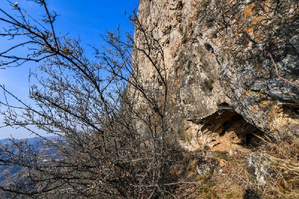 這次路程明顯縮短,但卻十分陡峭。有的路段,我們只能側(cè)著身子,石階僅容一只腳,兩只手只能扒著峭壁,而身后就是懸崖,有時需要雙腿跪著,慢慢挪動身體。由于沒吃、沒喝,嘴唇干裂起皮,開口說話也有點(diǎn)吃力。這樣攀爬一個多小時后,一個山洞進(jìn)入我們的視野。