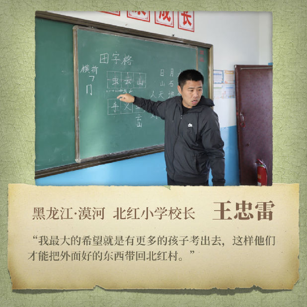 這所位于黑龍江省漠河市北極鎮(zhèn)北紅村的北紅小學(xué)只有兩位老師、3個(gè)年級(jí)和11名學(xué)生?!?0后”校長(zhǎng)王忠雷每天在數(shù)學(xué)、體育、思想品德三個(gè)科目中“周旋”。打開課件,他向?qū)W生熟練講授“體積與容積”相關(guān)知識(shí)的時(shí)候,隔壁教室傳來妻子于晶的語(yǔ)文課上孩子們瑯瑯的讀書聲……