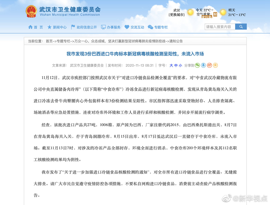 經(jīng)查,該批次進(jìn)口產(chǎn)品共27噸,1006箱,原產(chǎn)國為巴西,廠家注冊(cè)代碼2015,由巴西桑托斯港出關(guān),8月7日在青島黃島海關(guān)入關(guān),存于青島潤(rùn)渤冷庫,8月15日出庫,8月17日抵達(dá)武漢后一直儲(chǔ)存于中食冷庫,未流入市場(chǎng)。截至11月13日7時(shí),對(duì)涉及的冷凍產(chǎn)品全部封存,環(huán)境全面進(jìn)行消殺,中食冷庫200個(gè)環(huán)境樣本及其112名職工核酸檢測(cè)結(jié)果均為陰性。