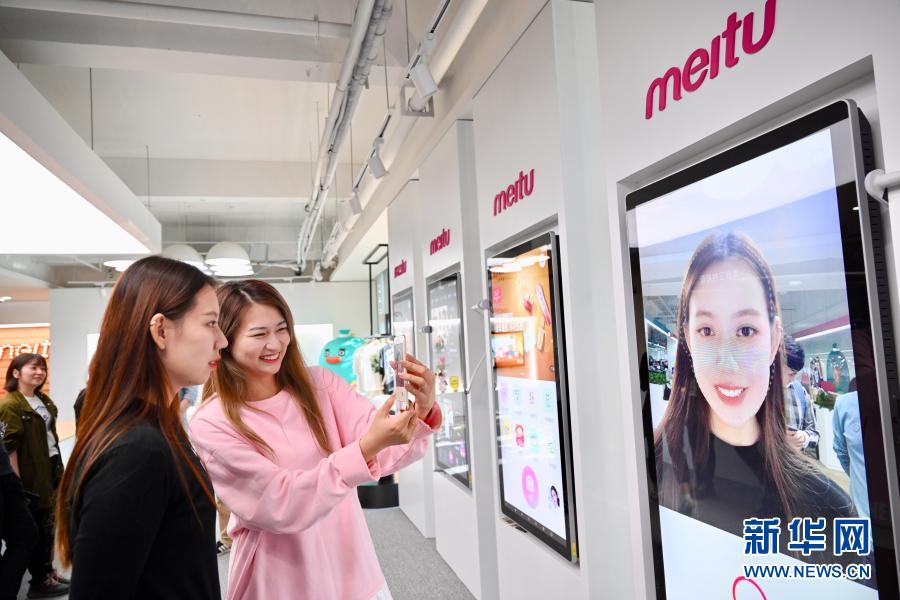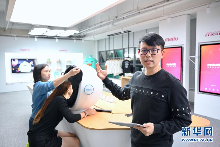 11月10日,在美圖公司展廳,工作人員在用美圖app拍照。新華社記者 姜克紅 攝