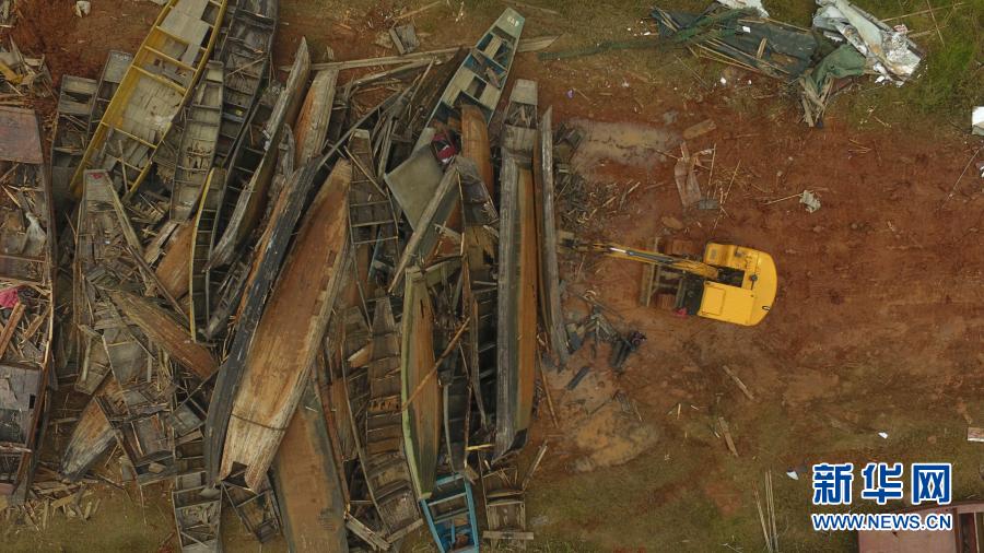 在湖南常德漢壽縣蔣家嘴鎮(zhèn),工作人員在洞庭湖邊駕駛挖掘機(jī)拆解漁民上交的漁船(2019年12月17日攝,無人機(jī)照片)。新華社記者 薛宇舸 攝