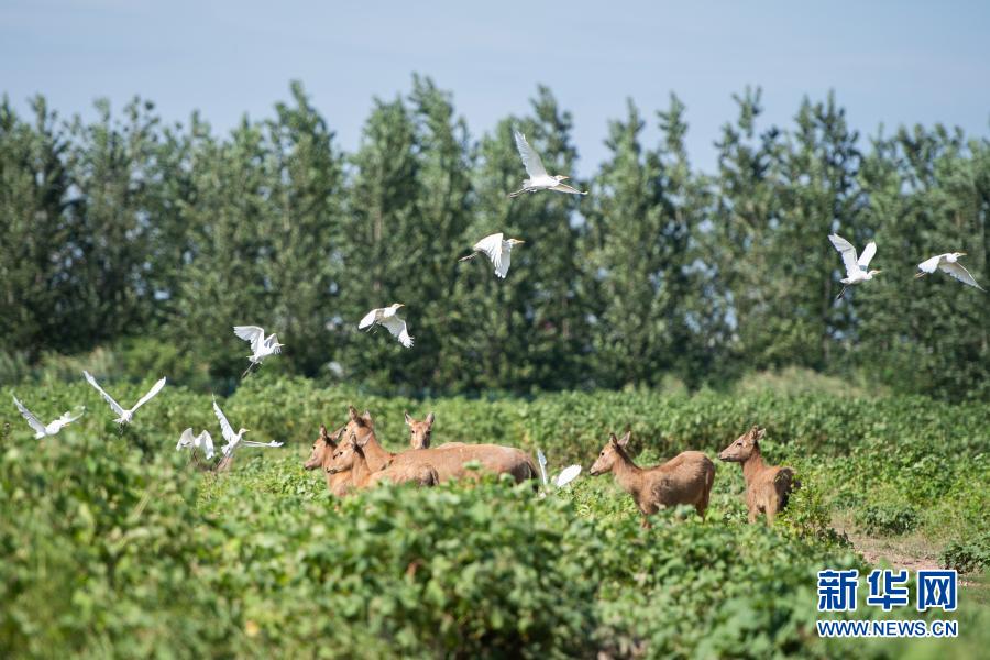在位于湖南岳陽市的東洞庭湖麋鹿和鳥類救治避難中心拍攝的麋鹿和飛鳥(8月7日攝)。新華社記者 陳思汗 攝