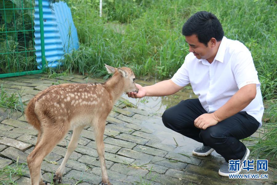 東洞庭湖麋鹿保護(hù)協(xié)會(huì)會(huì)長李政與小麋鹿“果果”互動(dòng)(7月8日攝)。新華社記者 蔡瀟瀟 攝