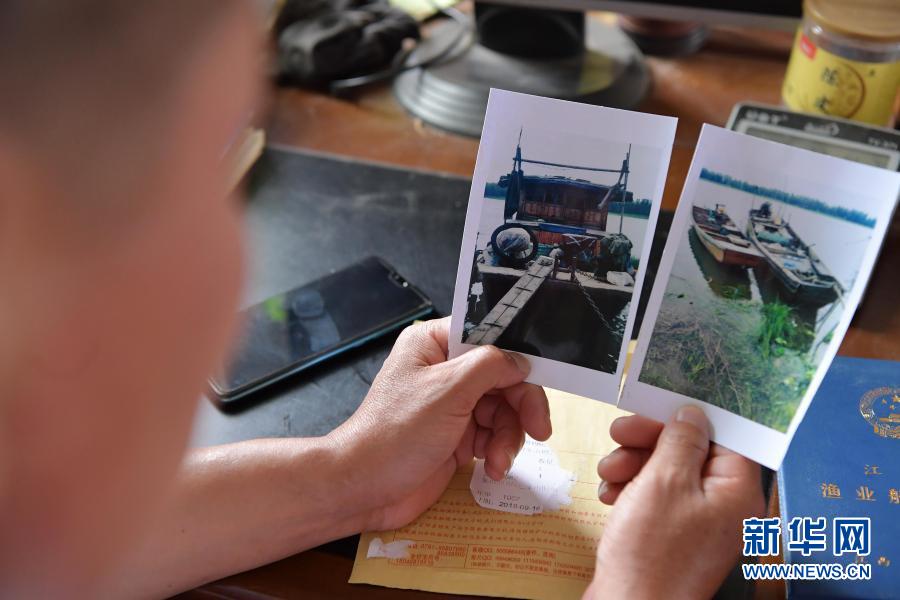 在江西省南昌市新建區(qū)象山鎮(zhèn),上岸漁民吳華山在展示自己珍藏的兩張漁船的照片。這兩條船是吳華山還在當(dāng)漁民時(shí)使用的捕撈船只,上岸轉(zhuǎn)業(yè)之后,船只上交,他用領(lǐng)到的補(bǔ)貼開始承包魚塘養(yǎng)殖小龍蝦(6月5日攝)。新華社記者 彭昭之 攝