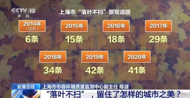 陳波:上海是一個(gè)人文之城,是一個(gè)海納百川的城市,我們希望這些景致能有一些代表性。但也不是每一條道路都適合開(kāi)展“落葉不掃”,因?yàn)槔锩孢€有考慮到交通通行情況,包括有些路段可能在一段時(shí)間會(huì)有一些施工等等,肯定不適宜開(kāi)展“落葉不掃”。