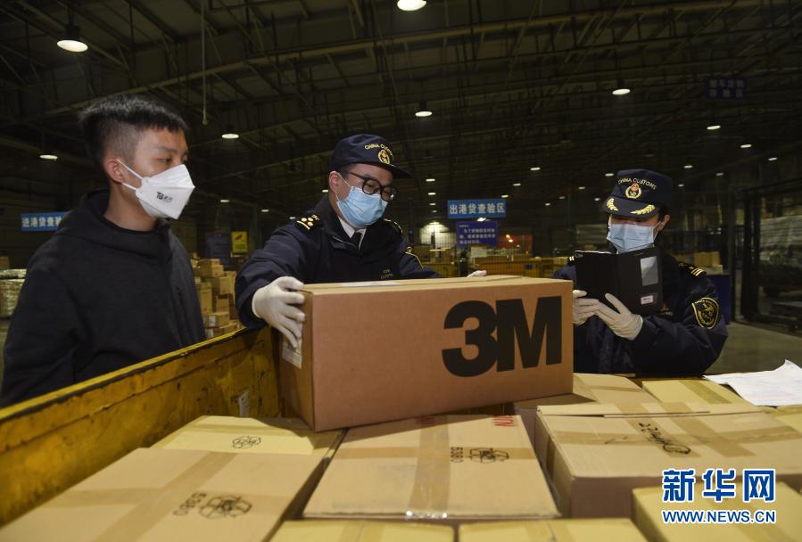 抗擊新冠疫情期間,成都海關(guān)關(guān)員在雙流機(jī)場口岸查驗防護(hù)物資,做到即到即提,實現(xiàn)疫情物資通關(guān)“零延時”(1月30日攝)。新華社記者 劉坤 攝