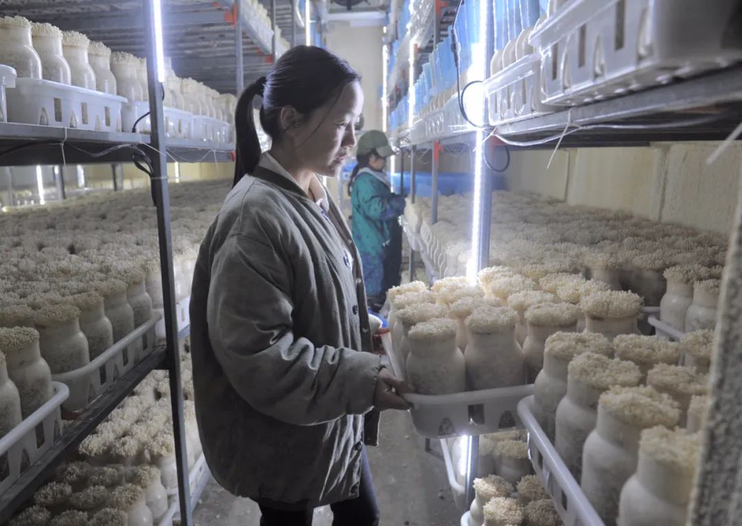 贛州市章貢區(qū)沙石鎮(zhèn)火燃村的貧困戶(hù)家庭成員,在扶貧車(chē)間低溫環(huán)境下從事蘑菇生產(chǎn),實(shí)現(xiàn)就業(yè)脫貧 李傳材 攝