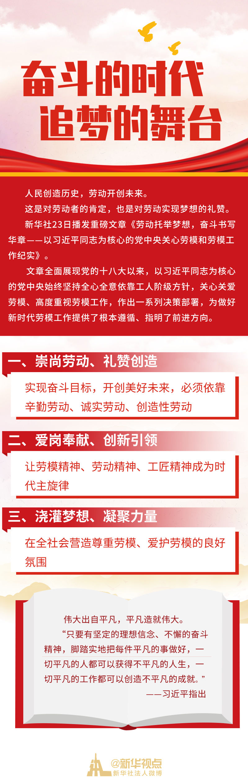 新華社23日播發(fā)重磅文章《勞動托舉夢想,奮斗書寫華章——以習近平同志為核心的黨中央關心勞模和勞模工作紀實》。
