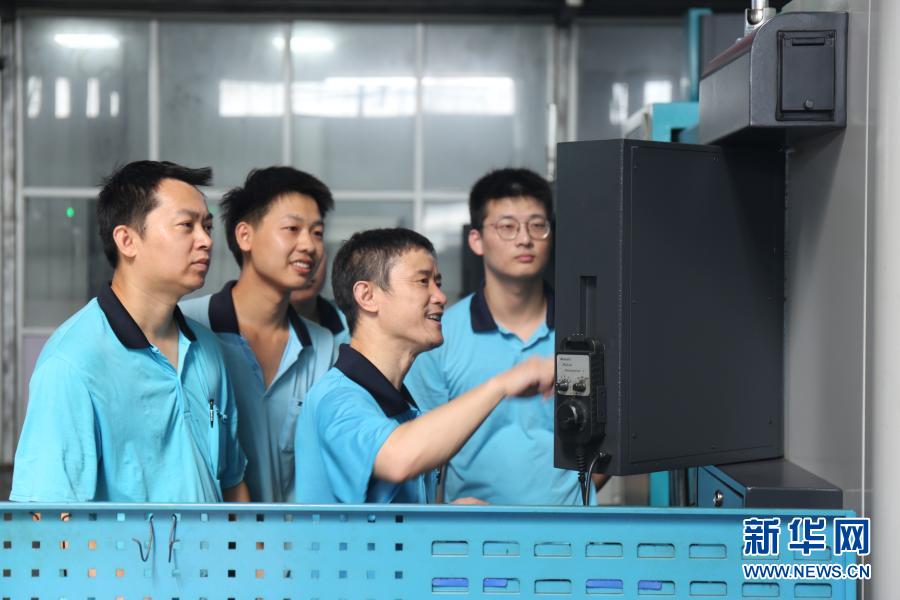 全國勞動模范、寧波中大力德智能傳動股份有限公司設備科科長萬亞勇(右二)在車間指導員工進行數(shù)控機床故障診斷(8月17日攝)。新華社發(fā)