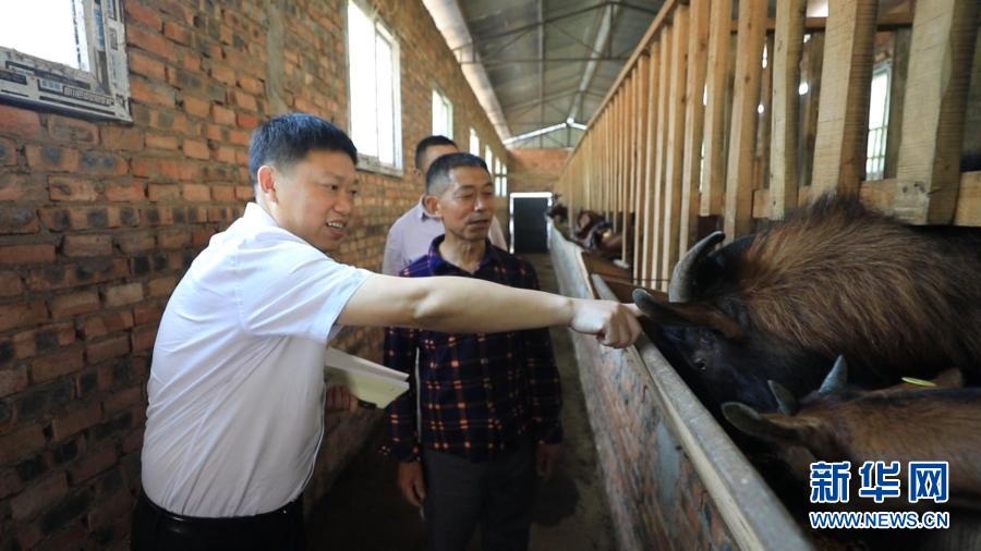 全國勞動模范、四川省南江五郎黃羊養(yǎng)殖專業(yè)合作社理事長汪其德(左一)在巴中市南江縣紅旗村村民家中指導養(yǎng)羊技術(資料照片)。新華社發(fā)