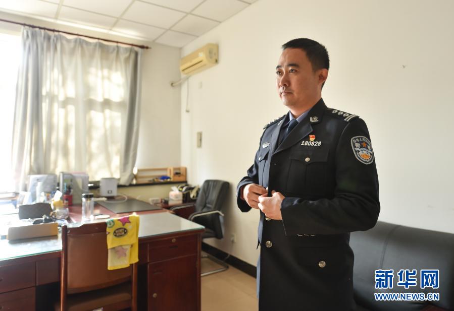 在天津市公安局物證鑒定中心,天津市公安局刑偵總隊(duì)十三支隊(duì)九大隊(duì)大隊(duì)長(zhǎng)張忻鑫在辦公室整理著裝(11月25日攝)。新華社發(fā)(孫凡越 攝)